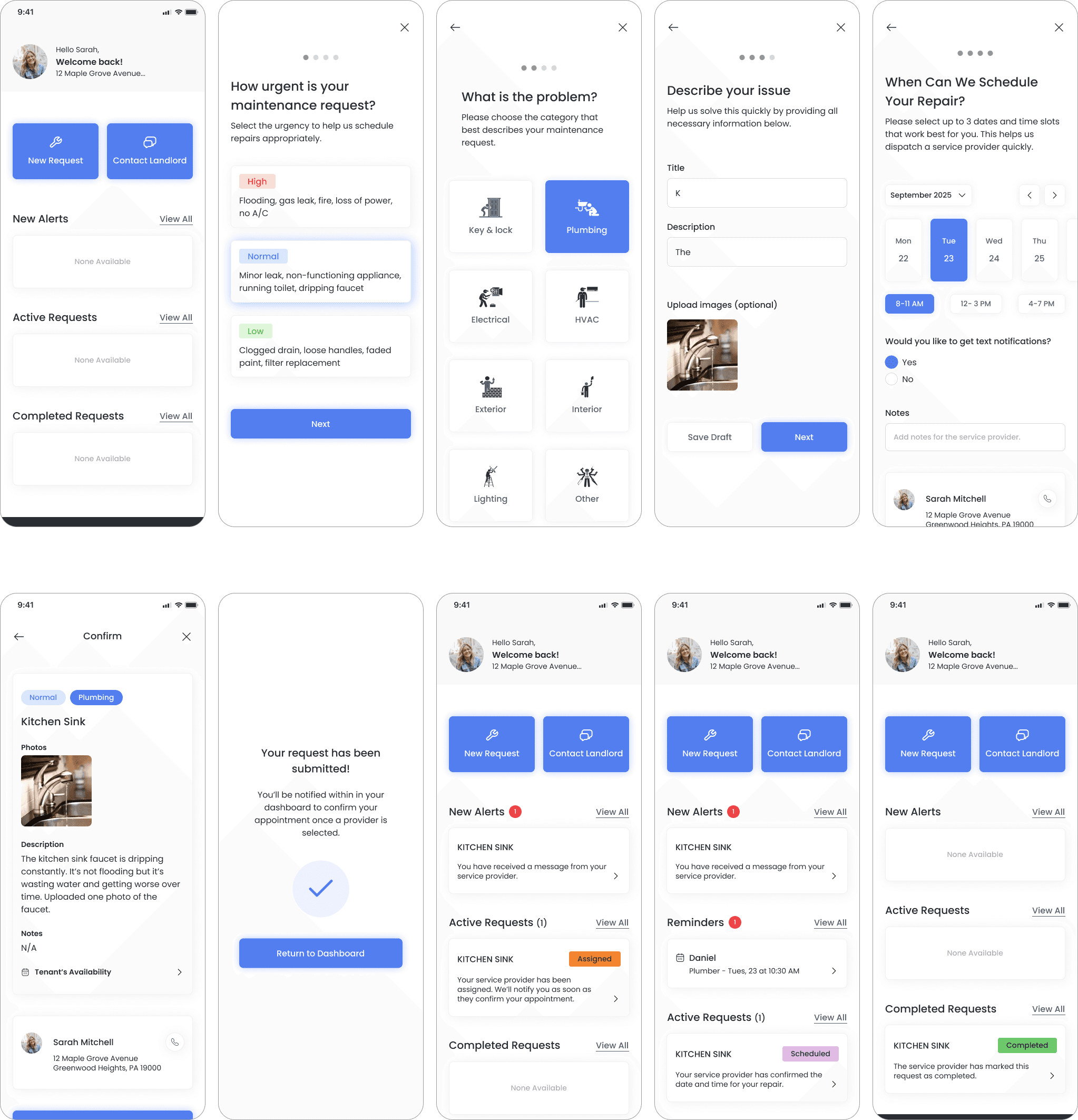 Based on insights from usability testing, I implemented key changes to create a more seamless user flow for tracking a maintenance request from submission through completion. The two videos below showcase the final interactive prototypes, highlighting both the tenant and landlord flows.