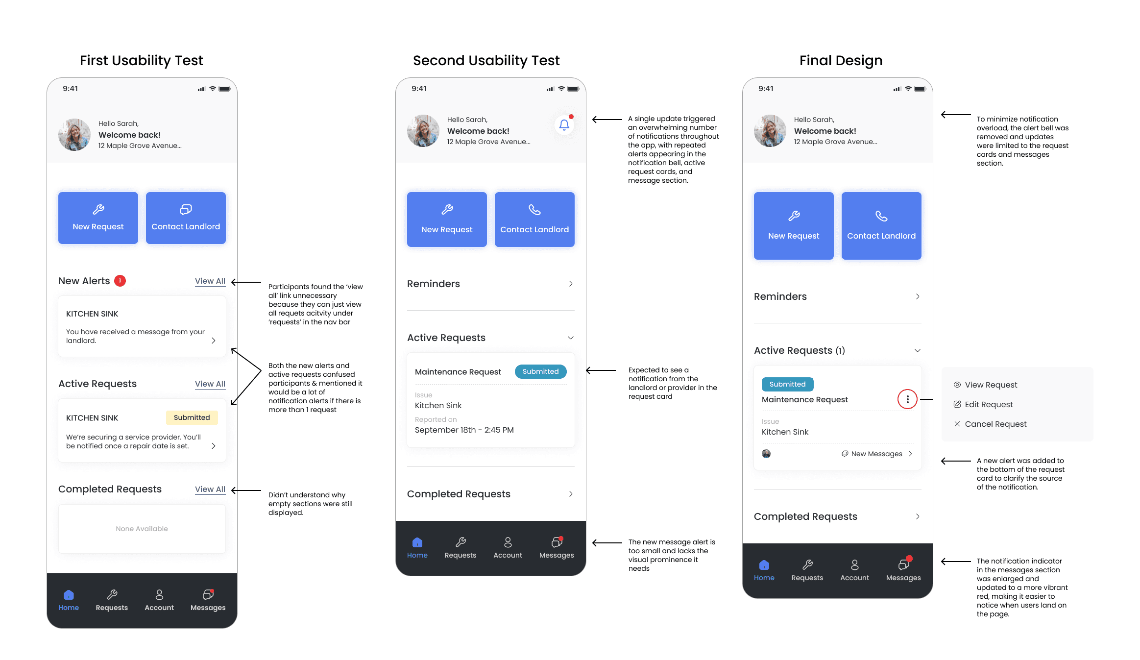 Based on the usability tests I conducted, the biggest challenge for users was understanding how notifications worked, specifically when updates came from the landlord or service provider. To address this, I refined the final dashboard in several ways: