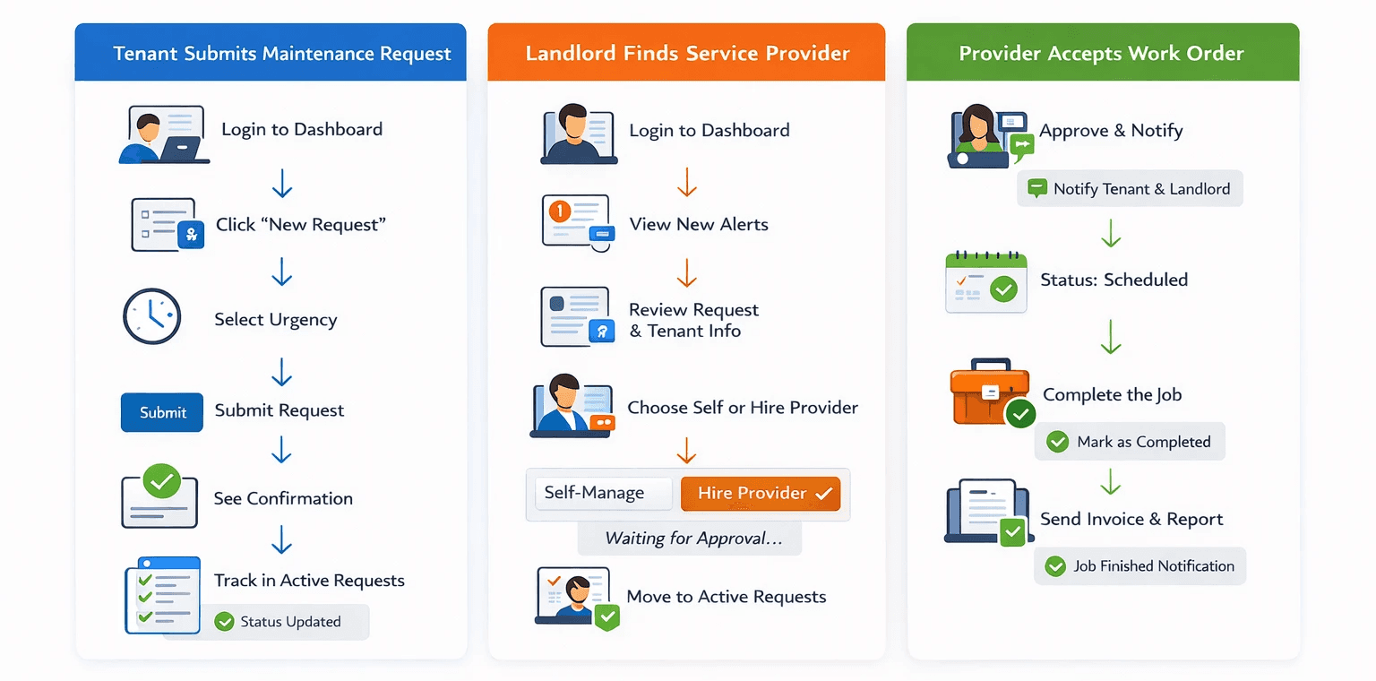 Landlords, tenants, and handymen can communicate directly through in-app messaging, ensuring clear and efficient communication for all parties.